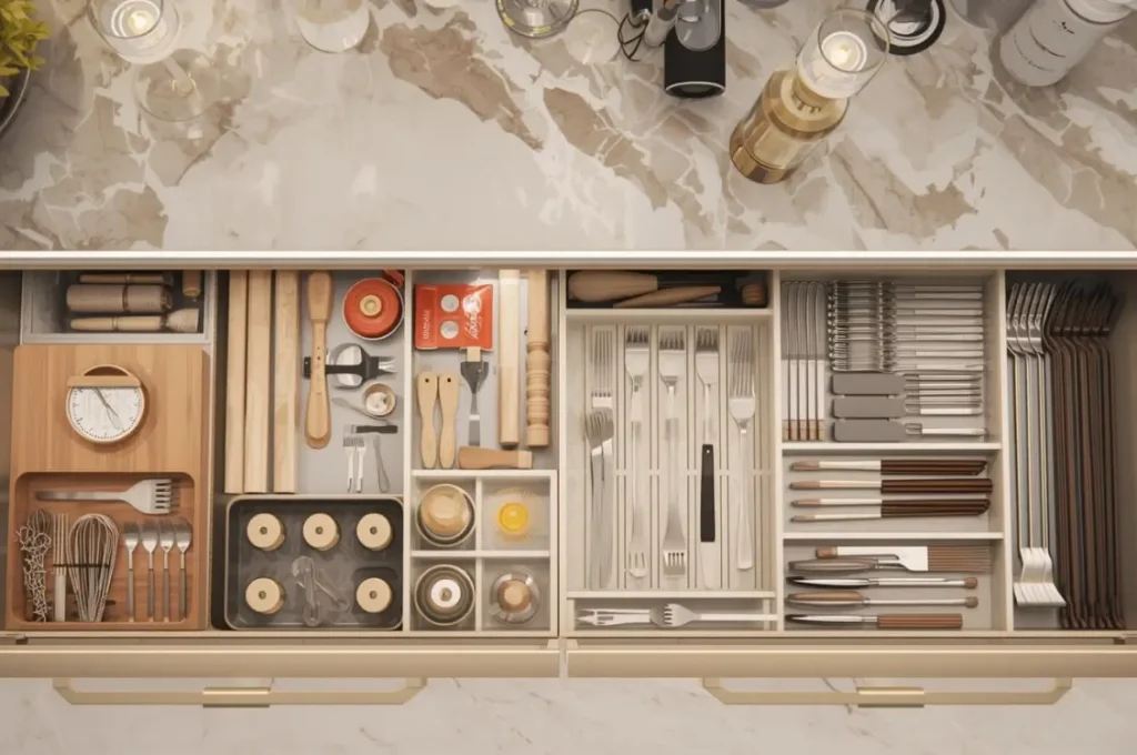 ক্যাবিনেটের ড্রয়ারগুলো অনেক গুরুত্বপূর্ণ। এগুলোর সঠিক ব্যবহার করতে হবে। চামচ, খুন্তি, কাচিসহ ছোটোখাটো জিনিসগুলো ড্রয়ারে রাখেন। ড্রয়ারে অতিরিক্ত জিনিস রাখা উচিত নয়। এগুলো জায়গা নষ্ট করে এবং রান্নাঘরকে অগোছালো মনে হয়। তাই ড্রয়ারের সঠিক ব্যবহার করে রান্নাঘরকে গুছিয়ে রাখুন।